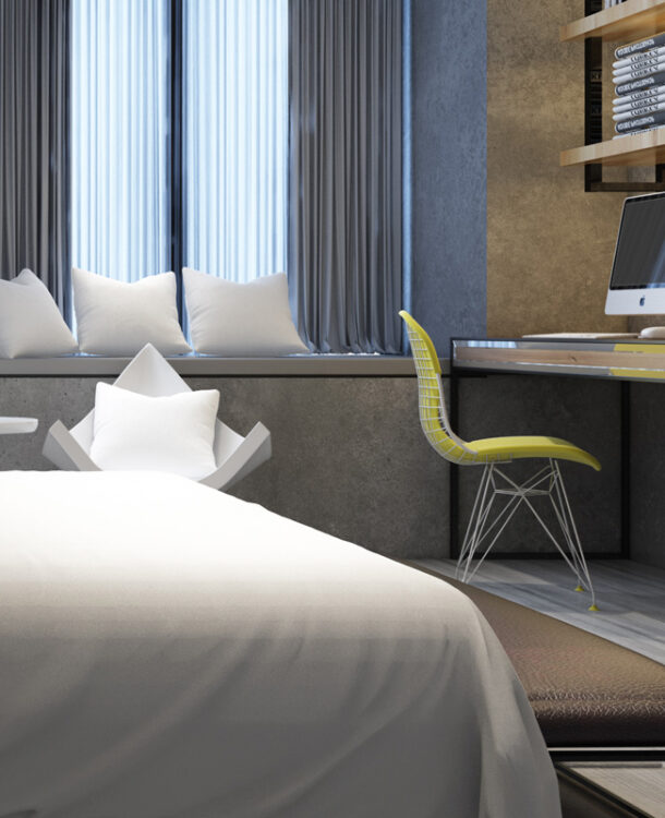The style of the interior was defined as modern in light colors. Main materials used in project are wallpaper etc.